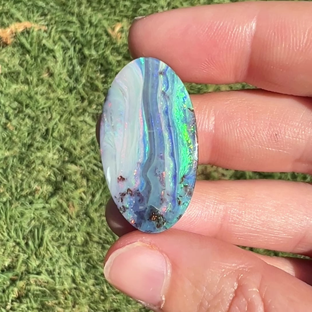 A large and rare boulder opal from our Mt. Margaret opal mine. Its classic oval shape and striped pattern make this opal the star in any bespoke opal jewelry piece.