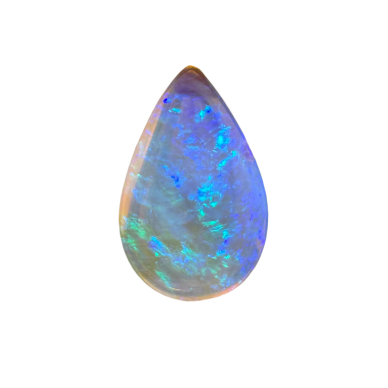 A beautiful crystal teardrop opal, with green, blue and purple colours.
