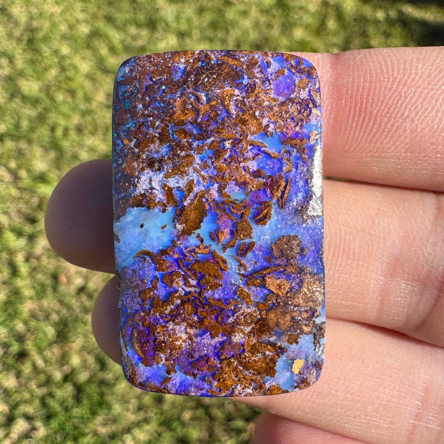 A large and rare boulder opal from our Yaraka opal mine. Its classic rectangle shape and blue and purple colours make this opal the star in any bespoke opal jewelry piece.