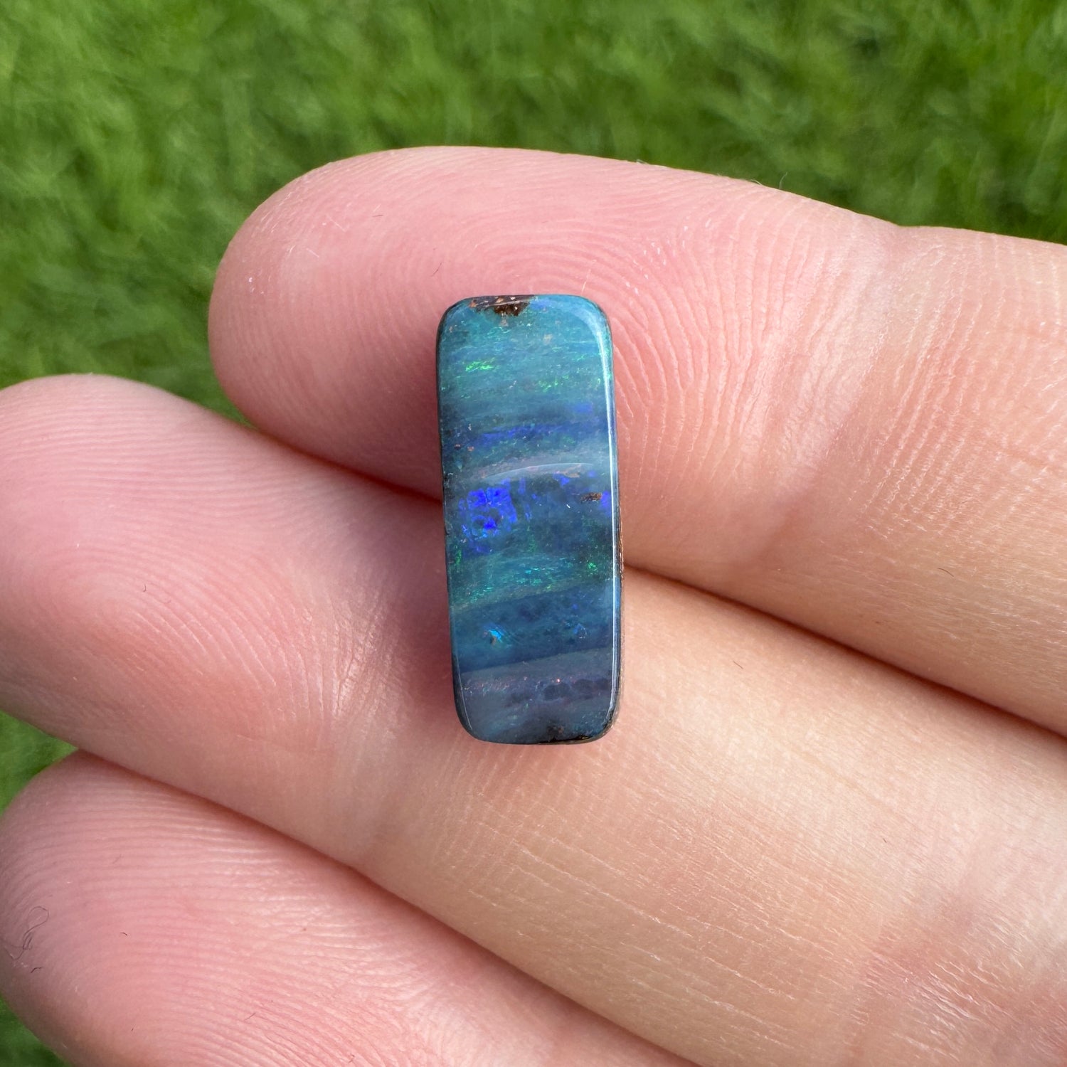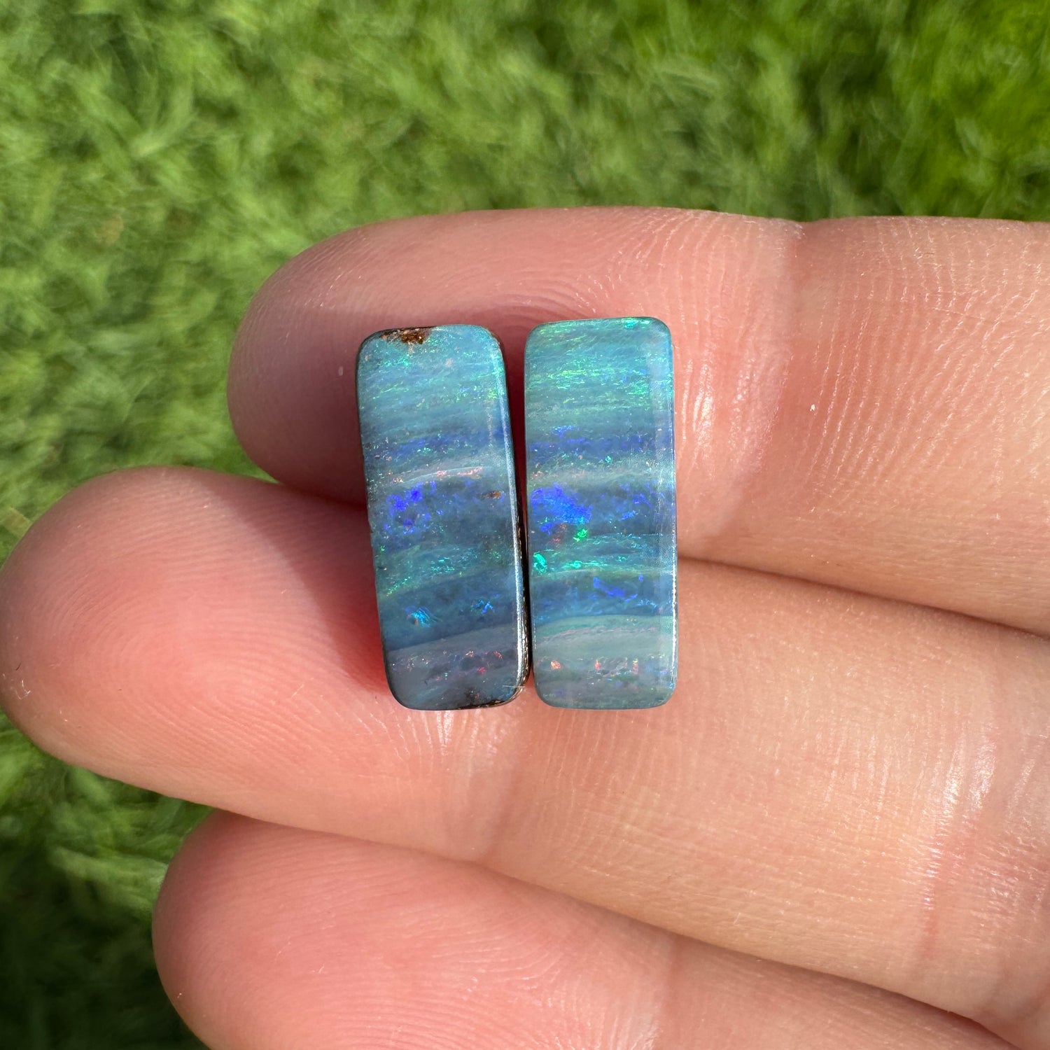 This beautiful 5.06 Ct narrow rectangle boulder opal pair is perfect for creating elegant earrings. They feature pink, green and blue striped pattern.