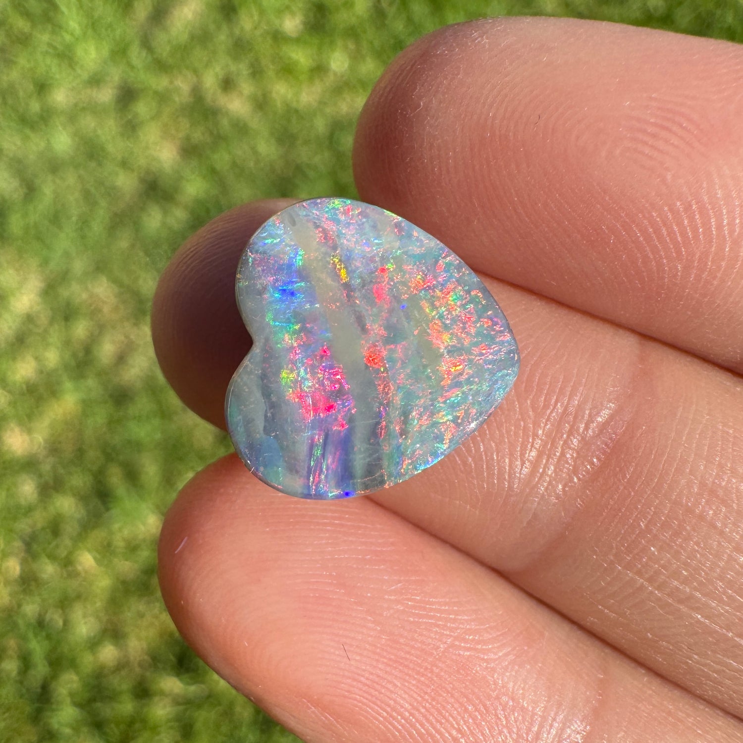 A stunning bright heart-shaped boulder opal with rainbow colours.