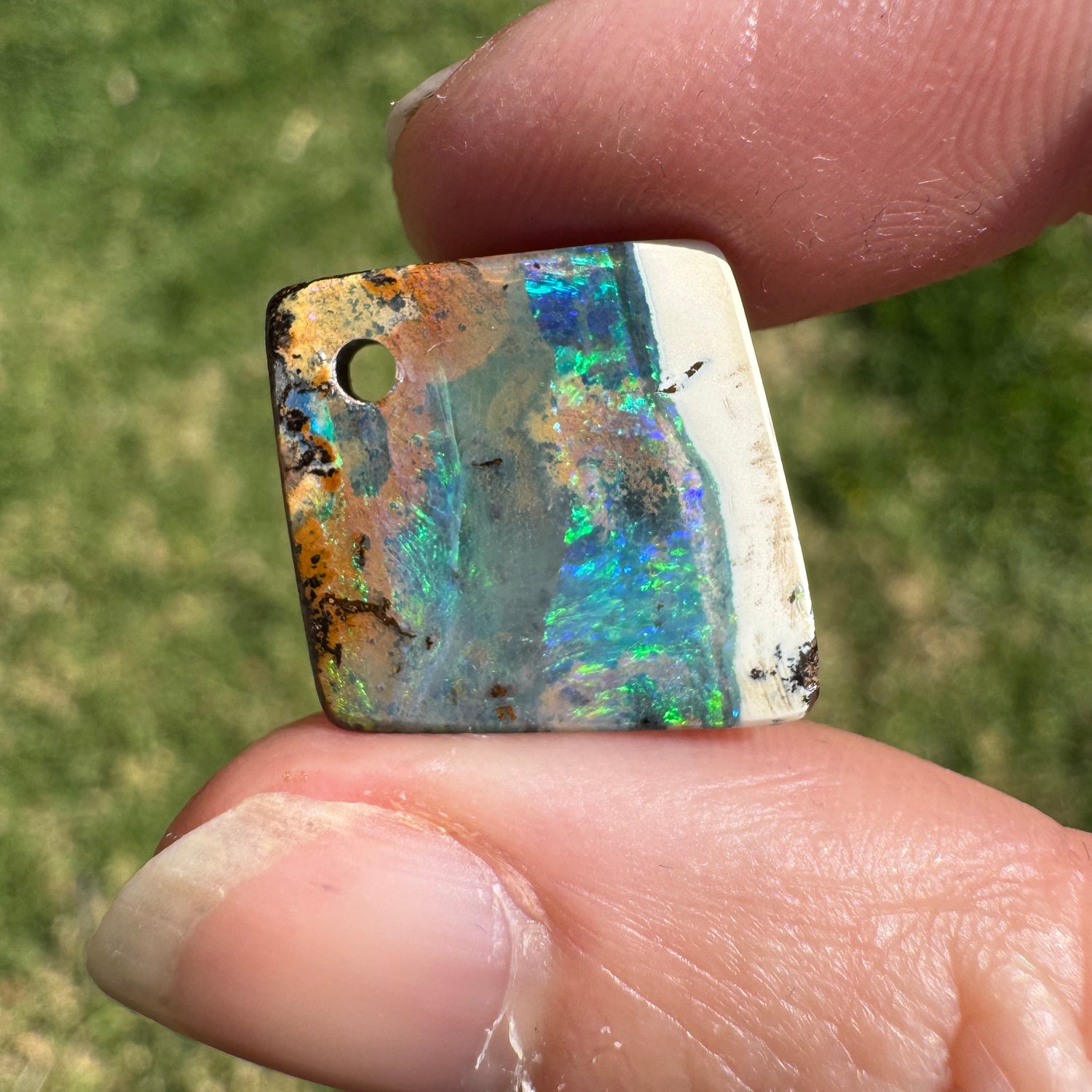 A beautiful large boulder opal that has has a ~1.6 mm drilled hole through its front.