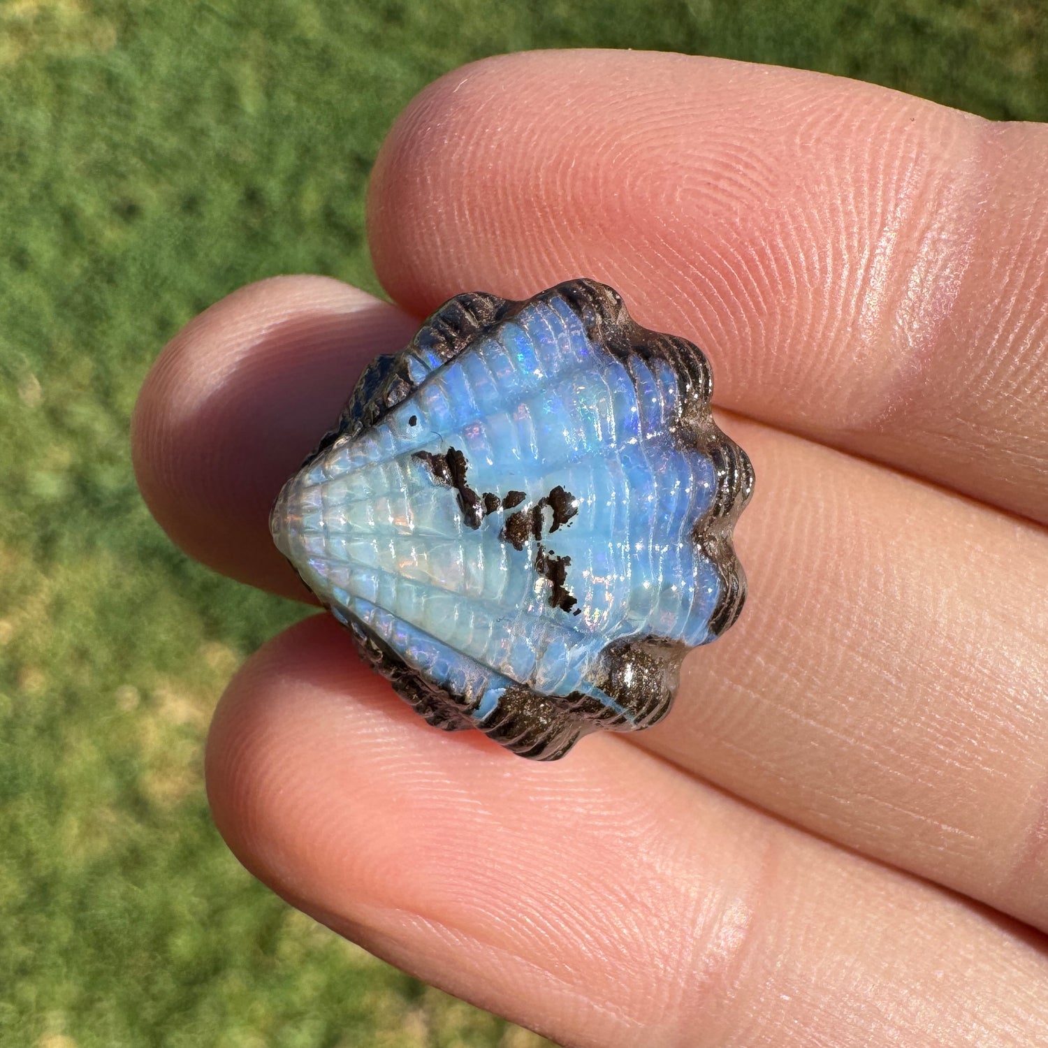 A lovely fan shell boulder opal carving. Please note this is very limited stock, so don't miss out.