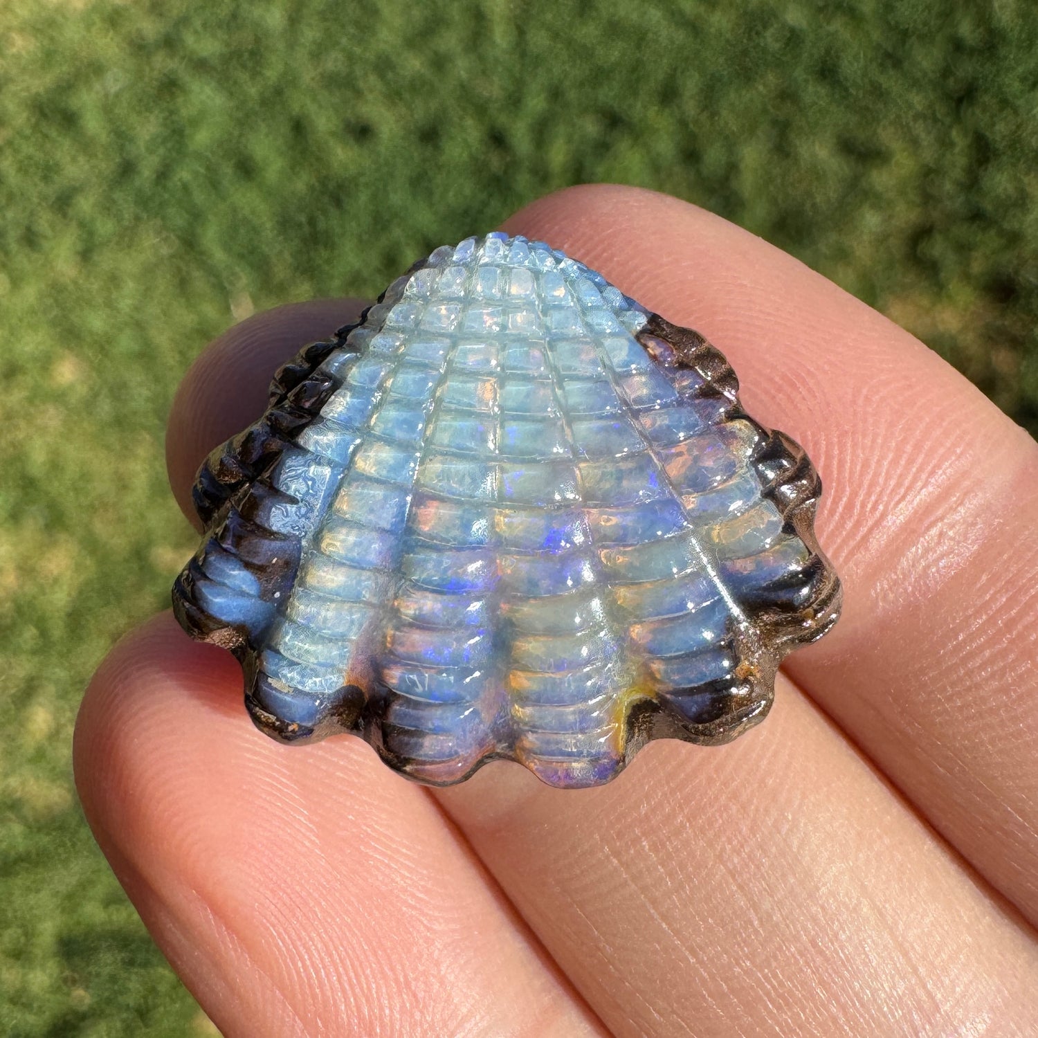 A lovely large fan shell boulder opal carving. Please note this is very limited stock, so don't miss out.