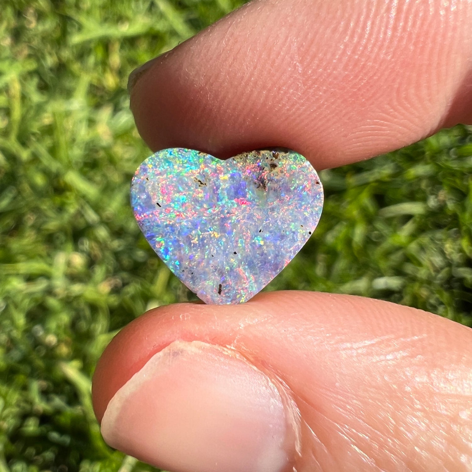 A stunning rainbow heart boulder opal with a purple-hue.