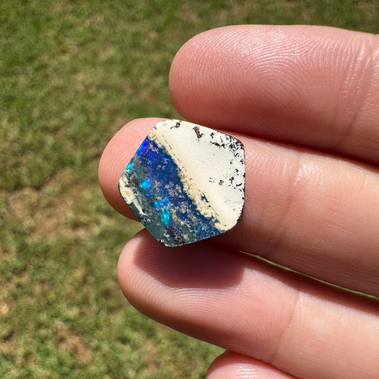 A lovely pentagon boulder opal with a rolling bright blue and green flash.