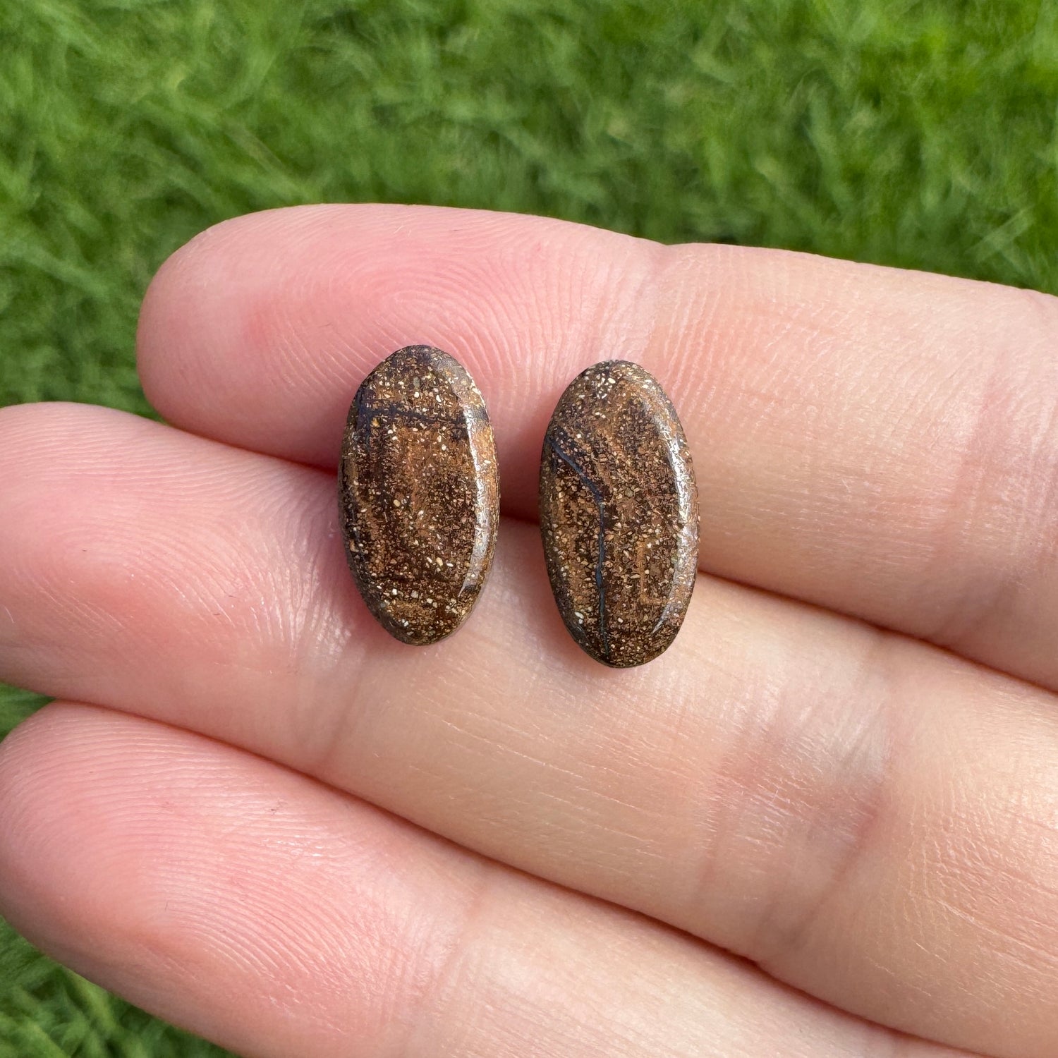 This beautiful 4.58 Ct oval boulder opal pair is perfect for creating elegant earrings. They feature a pink, green, purple and blue striped pattern.