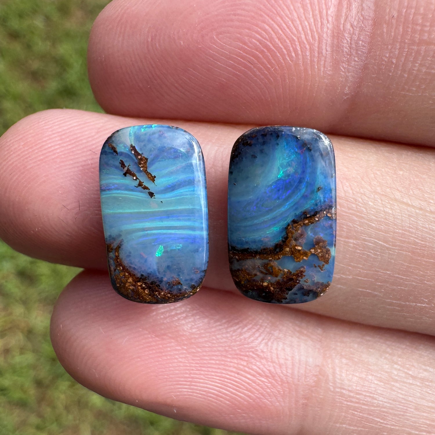 A lovely swirly green and blue boulder opal pair.