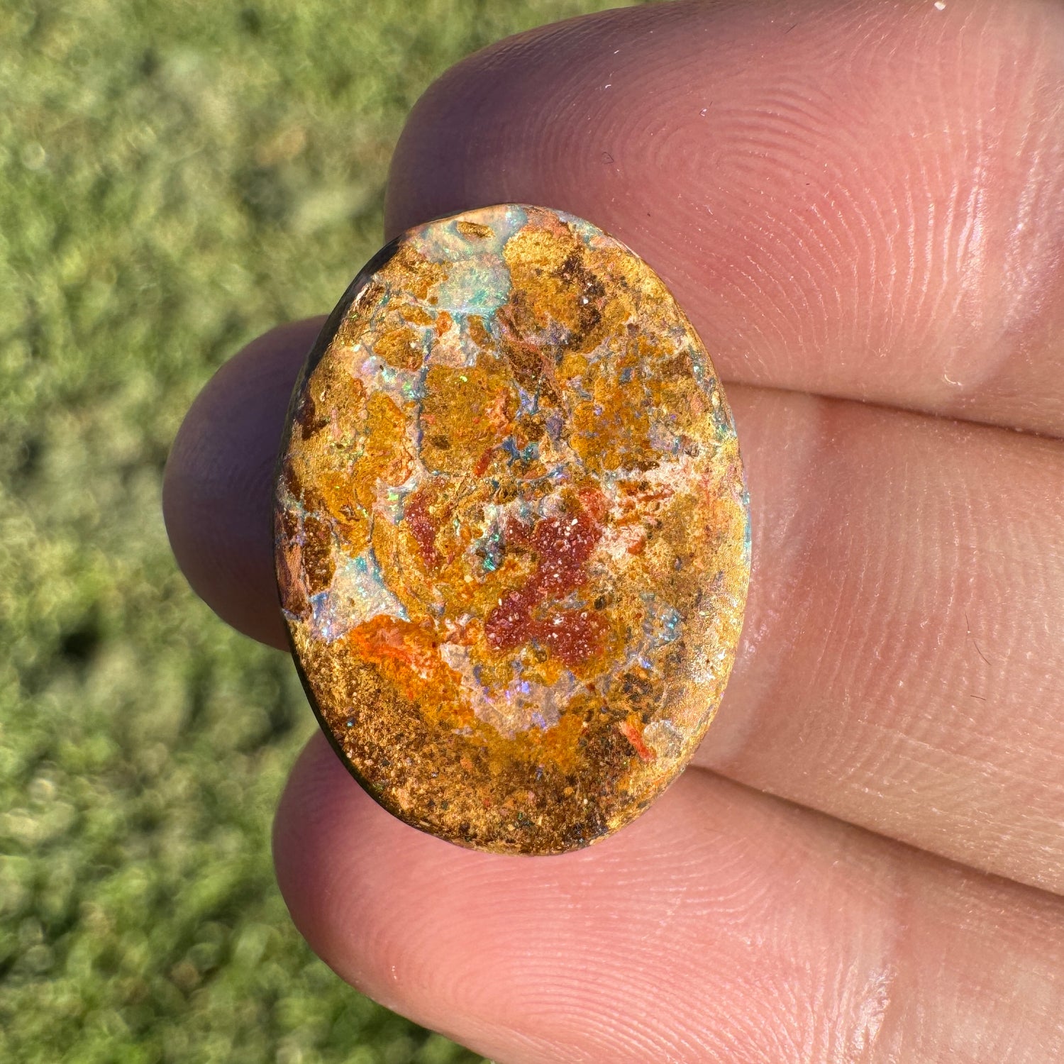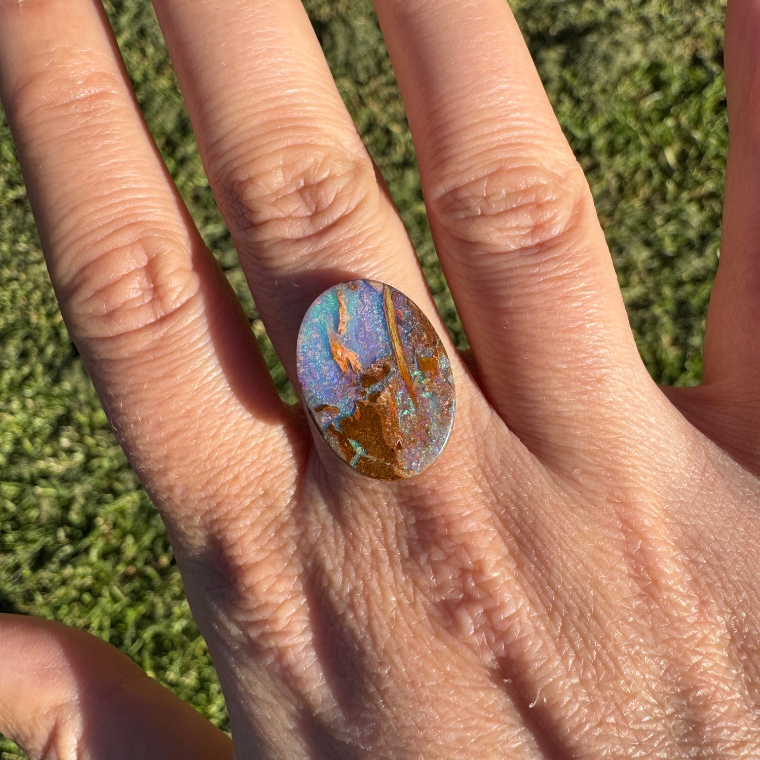 This special wood replacement opal has a classic oval shape and lovely green, blue and purple colours. It is hard to get in larger sizes like this, so don't miss out.