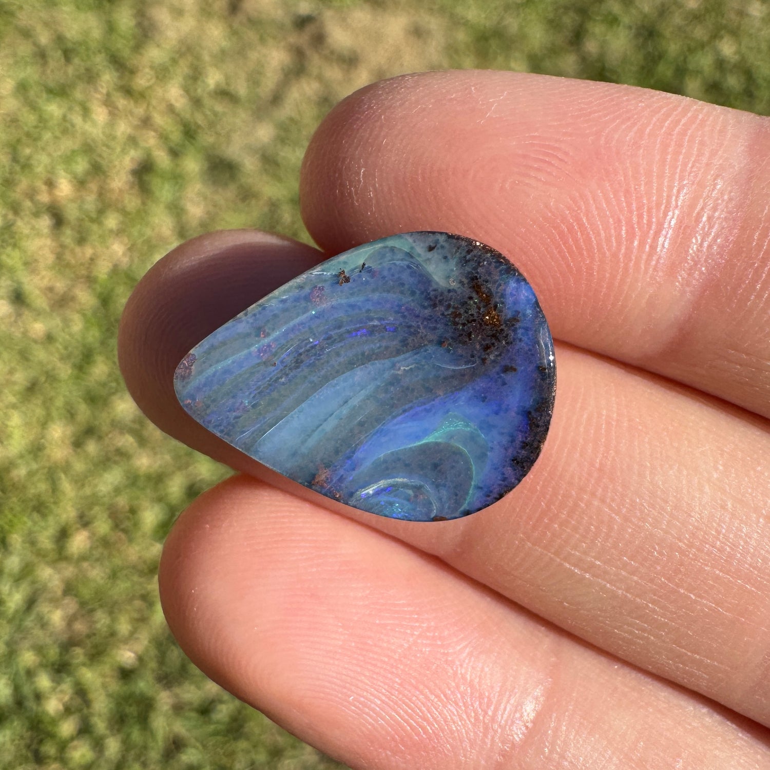 A beautiful larger teardrop boulder opal, with blue and purple swirls.